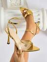 Jin Bei Qi Damhöga klackar, mode, fest, utomhus, exklusiv, samling, lackerad, asymmetrisk klack, fyrkantig tå, glänsande metalliskt material med blommig, sexig fotledsrem, justerbart spänne, eleganta, lyxiga, guldfärgade, formella sandaler, balsal, socialite, mångsidiga höga klackar
