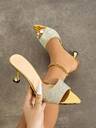 Jin Bei Qi Damhöga klackar, mode, fest, utomhus, exklusiv, samling, lackerad, asymmetrisk klack, fyrkantig tå, glänsande metalliskt material med blommig, sexig fotledsrem, justerbart spänne, eleganta, lyxiga, guldfärgade, formella sandaler, balsal, socialite, mångsidiga höga klackar