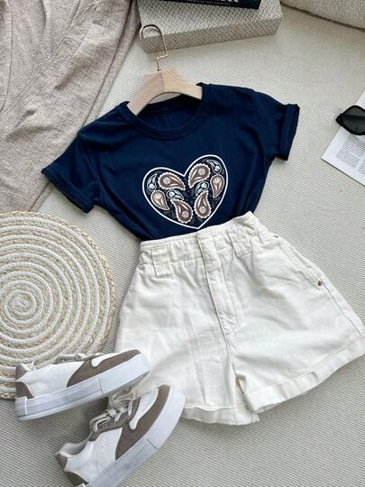Women's Cotton T-Shirt Simple Style Big Heart Water Drop