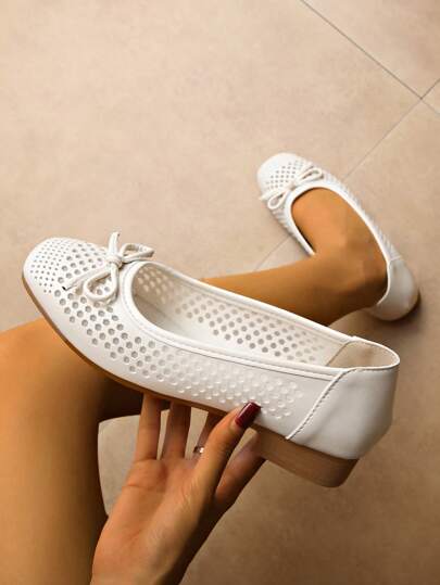 Women's Flat Shoes, Spring New Perforated Leather Flats, Shallow Bowknot Low Heel Soft Breathable Sandals