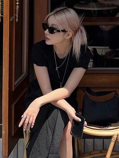 DAZY Kvinnors Texturerad Öppen Rygg T-shirts - Svart - Visa 1