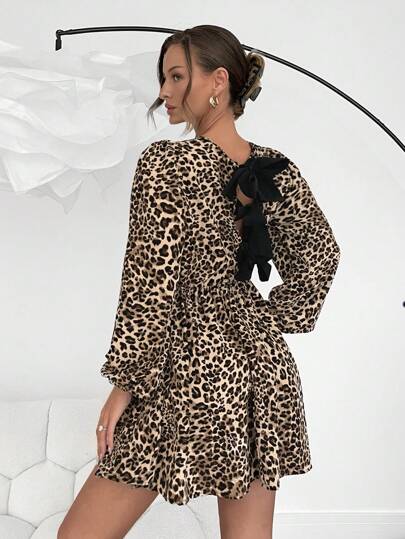 SHEIN Essnce Women Casual Long Sleeve Leopard Print Dress With Bow Decor On Back, Suitable For Casual Daily Wear In Autumn/Winter Christmas Women Clothes - Multicolor - View 1