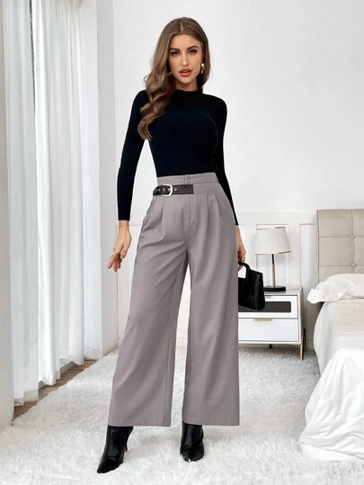 SHEIN Essnce Women High-Waist Contrast Buckle Detail Wide-Leg Suit Pants - Grey - View 1