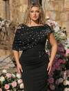 Glamrae Plus Size Elegant Luxurious Black Elastic Knit Contrast Mesh Asymmetric Ruffled Shoulder Fitted Fishtail Hem Dress, Suitable For Evening Party, Singles Party, Date, Ball, Holiday, Wedding Plus Size Black Elegant Dress