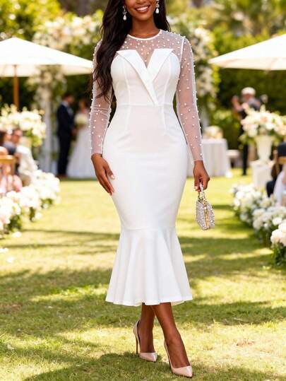 Women Valentine White Sheer Pearl Embellished V Neck Long Sleeves Fitted Mermaid Hem Dress Formal Occasions Wedding Guest - White - View 1