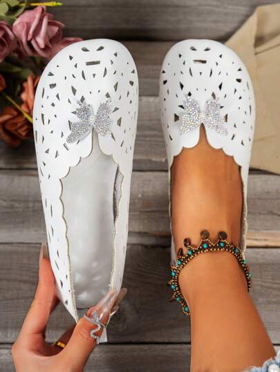 Women's Comfortable Flat Shoes, Rhinestone Butterfly Detail, Round Toe Hollow Design, Lightweight & Breathable, Flexible Outsole, Soft Microfiber Insole, Slip-On Casual Flats Suitable For Entertainment, Parties, Outdoor - White - View 1