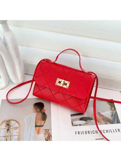 Women's Fashion Minimalist Rhombus Mini Square Bag, Embossed PU Leather With Metal Clasp - Crossbody/Handbag For Daily Use - Red - View 1