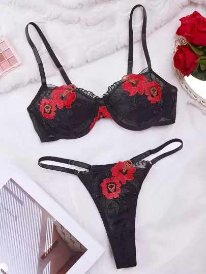 Kvinnors Blommiga Broderier Nät Sexiga Underkläder Uppsättningar - Svart - Visa 1