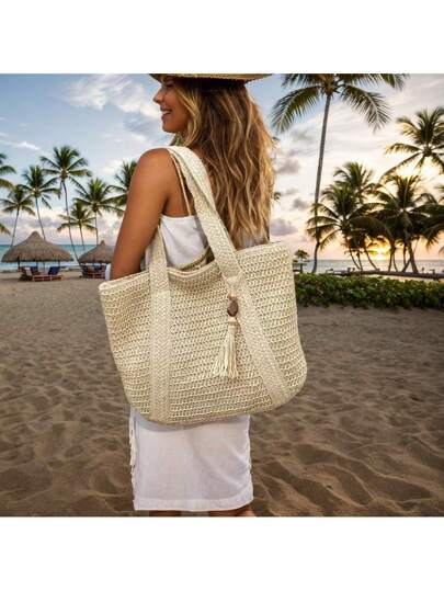 Stor damstrandväska med strå, vävd axelväska med tofsar, resväska med avslappnad design, bärbar bohemisk vikbar förvaringsväska, semestertillbehör, perfekt matchande med strandaccessoarer för kvinnor, hetaste strandväskor för kvinnor, strandnödvändigheter, strandtillbehör, strandprylar och sommartillbehör, nyaste semesterväska - Vitt - Visa 1