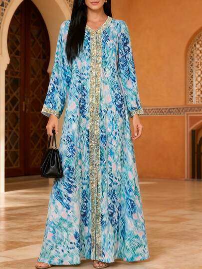 Women's Muslim Printed Robe, Patchwork Embroidery Lace V-Neck Long Sleeve, Arabic Dubai Style Abaya - Blue - View 1
