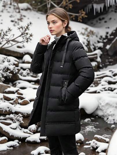 Women's Padded Coat, Long Style Padded Coat, Women's Winter Zip-Up Long Sleeve Jacket, Women's Hooded Long Padded Coat, Autumn/Winter Jacket, Women's Casual Zip-Up Fluffy Hooded Long Padded Coat - Autumn/Winter - Black - View 1