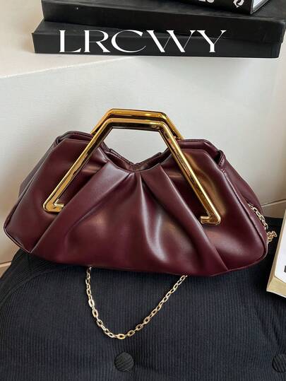 Women's Pleated Handbag, Elegant Lady Luxury Metal Chain Decor Shoulder Bag, Suitable For Shopping, Dating, Party, Wine Red - Burgundy - View 1
