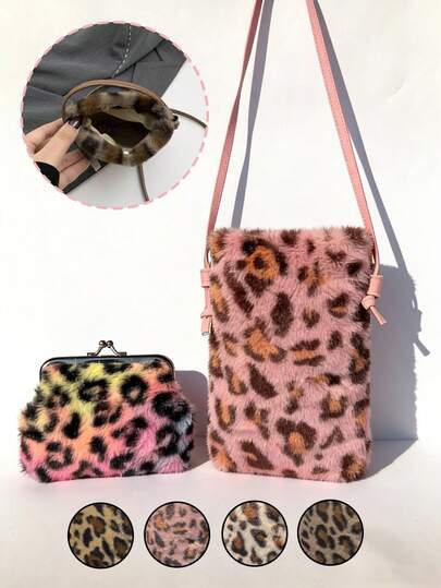 Women's Plush Faux Fur Leopard Print Crossbody Bag And Plush Leopard Print Coin Purse Set,Fashion Coin Purse,Leopard Print Fashion Minimalist Shoulder Bag, Magnetic Snap Closure Phone Pouch With Polyester Lining & Edge Paint Detail, Lightweight Compact Mobile Phone Bag - Multicolor - View 1