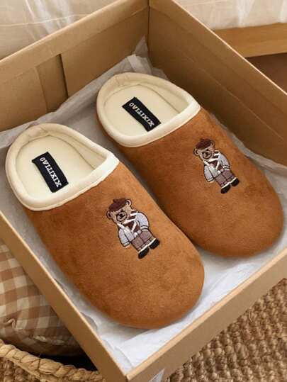 Women's Spring&Fall Embroidered Bear Design Lightweight Soft Fabric Slippers, Slip-Resistant Comfortable Indoor Home Casual Fashion Cute Brown Slides - Brown - View 1