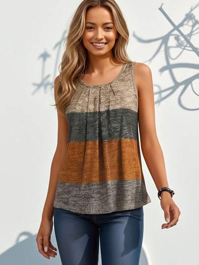New Fashionable Digital Print Milk Silk Fabric, Cool Summer Material, Suitable For Dates, Home, Vacation, Camping, Beach, Photography, Dancing, Parties, Shopping, Versatile, Vacation Style Women, Casual Striped Print Sleeveless Tank Top For Spring/Summer Women