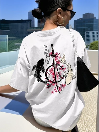 Women's White Crew Neck Short Sleeve T-Shirt With Koi Fish Pattern, Casual Japanese Style Versatile Top, Suitable For Daily Wear - White - View 1