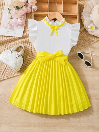 Liten Tjejer Mössa Tvåfärgad Plisserad Fåll Klänningar - Gul - Visa 1