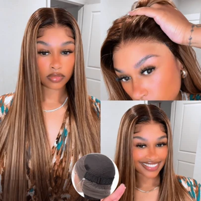 ZHENDEFA 4/27 Ombre Honungsguld Rakt Äkta Hår Osynligt 360 Graders Helspets Peruk Med 200% Densitet Brasilianskt Remy Hårfäste - S4/27 - Visa 1