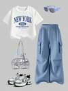 Tween Girls' Casual Fashion Street Style Letter Print Dropped Shoulder Loose White T-Shirt And Pleated Pocket Cargo Pants Set, Spring/Summer/Autumn