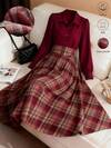 GlowEve Damklänning i vinröd rutig lapptäcke med skjortmönster, midja, åtsittande A-linje, elegant, vardag, fransk, avslappnad, pendling, mode, retro, mångsidig, jul, nyår, helgdag, affärsklänning, vinröd långärmad, höst/vinter