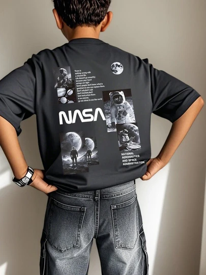 Tween Boys 1pc rymd- och flygplanstryck kortärmad rund hals t-shirt, sommartoppar för unga studenter - Mörkgrå - Visa 6