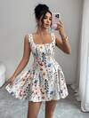 Selianne Romantic French Style Colorful Floral Square Neck Camisole Dress, Sweet & Age-Reducing High Waist A-Line Dress, Summer Waist Cinched Floral Beach/Office Dress, Elegant & Sexy Ladies Summer Dress