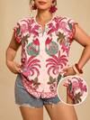 Travachic Plus Size Women's Fuchsia Tropical Plant Print Shirt With Ruffle Hem And Embroidered Cuffs Spring Outfit Women Summer Holiday Outfits Beach Outfit For Women Vacation Outfits Tropical Print Graphic Tees Women Casual Blouses For Women Going Out Top