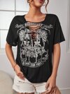 SHEIN Essnce Skull Rack & Floral Print Ladder Cut Out Drop Shoulder Tee