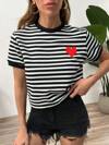 EURMUSE Summer Contrasting Colors Heart Print Black And White Striped Short Sleeves Fit Tee, Casual Style