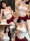 DAZY Spring & Summer Fashion White Heart Print Bandeau Top, Sexy Music Festival, Valentine's Day, Casual Beach Vacation Style, Fitted Cropped Camisole For Women