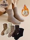 5 Pairs (Random Assortment) [Practical & Warm] Universal Earth-Tone Knit Element Thermal Lined Socks, Suitable For Indoor And Outdoor Wear In Winter