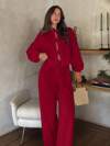Cloudara Women Solid Color Wide Leg Baloon Sleeves Front Bow Tie Details Two Pieces Set