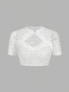 SHEIN Frenchy Women Floral Lace Hollow Out Design Short Sleeve Sexy Crop Top,Women's Sexy Sheer Lace Cropped Top, Ladies' Lace Trimmed Short Sleeve Top With Sweetheart Collar And Ruched Design, Women's Solid Color Simple Daily Hollow-Out Lace Trim Short Sleeve Blouse Casual White Summer