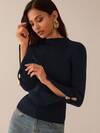 Lilora Long Sleeve Slit Metal Decor Bodycon Sweater In Fall/Winter Dark Blue Top Navy Top Navy Blue Sweater Officeelegance Old Money,ملابس شتوية للنساء,Cozy Fall And Winter Clothes For Women Ribbed Top Mock Neck Top