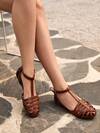 Tropiscape Women Hollow-Out T-Strap Flat Sandals, Comfortable Braided Openwork Flat Sandals, Brown Faux Leather Casual Slip-On Fishnet Cage Shoes, Brown Flat Summer Sandals Beach Autumn Winter Gifts