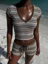 Aloruh New Casual Sporty Chic V-Neck Tight Striped Short Sleeve Top, Contrast Color Stripes, College Style, Suitable For Spring/Summer