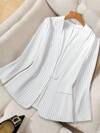 SHEIN Clasi Plus Size Women's Striped Mandarin Collar Long Sleeve Blazer Jacket, Elegant Retro Business Casual Outerwear, Summer Fall Cloth For Women