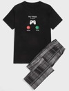 Men Gamepad & Slogan Graphic Tee & Plaid Pants PJ Set / Pajama Set