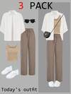 SHEIN LUNE 3pcs Black & White Maillard Women 2024 New Elegant Windbreaker Suit Set With Blouse And Wide Leg Pants, Stylish And Slimming, Autumn